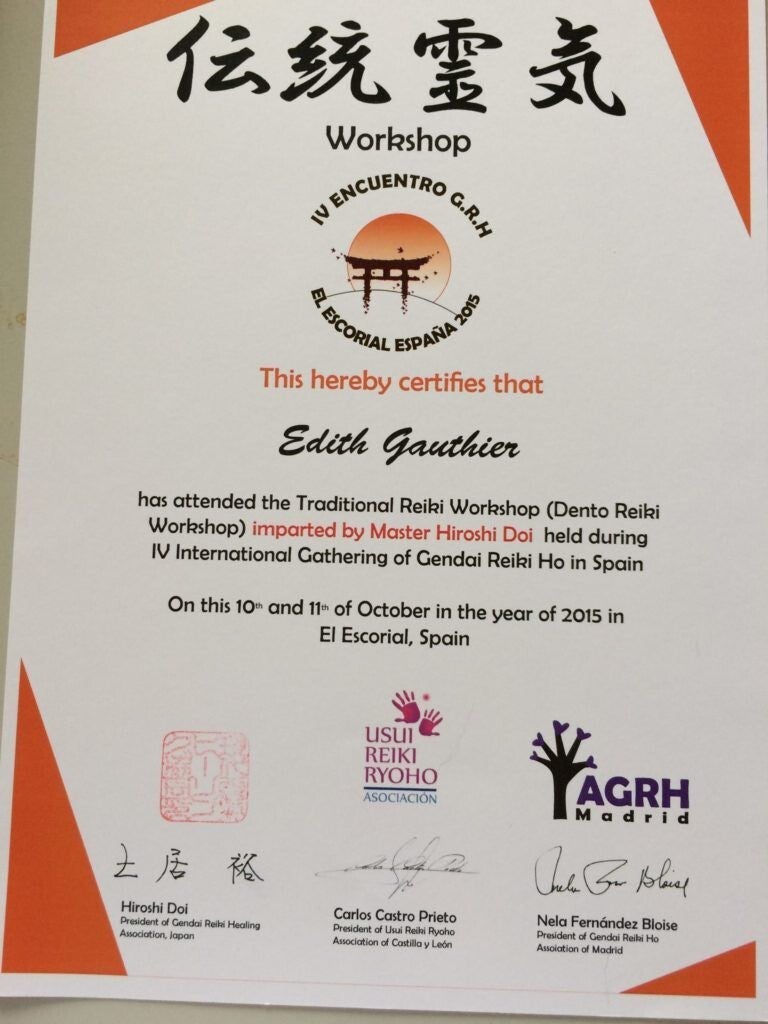ci-dessous le certificat délivré par Hiroshi DOI Sensei, validant mon enseignement : le "Dento-Reiki"